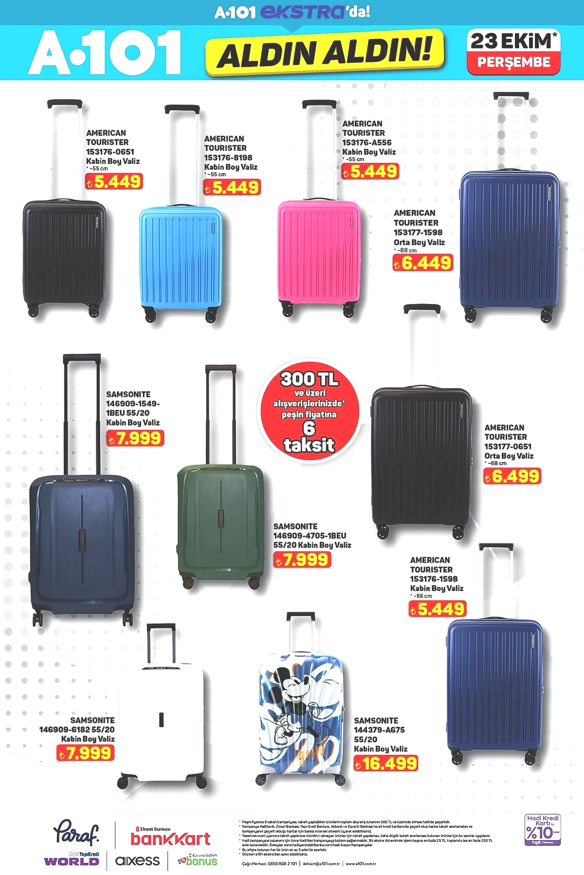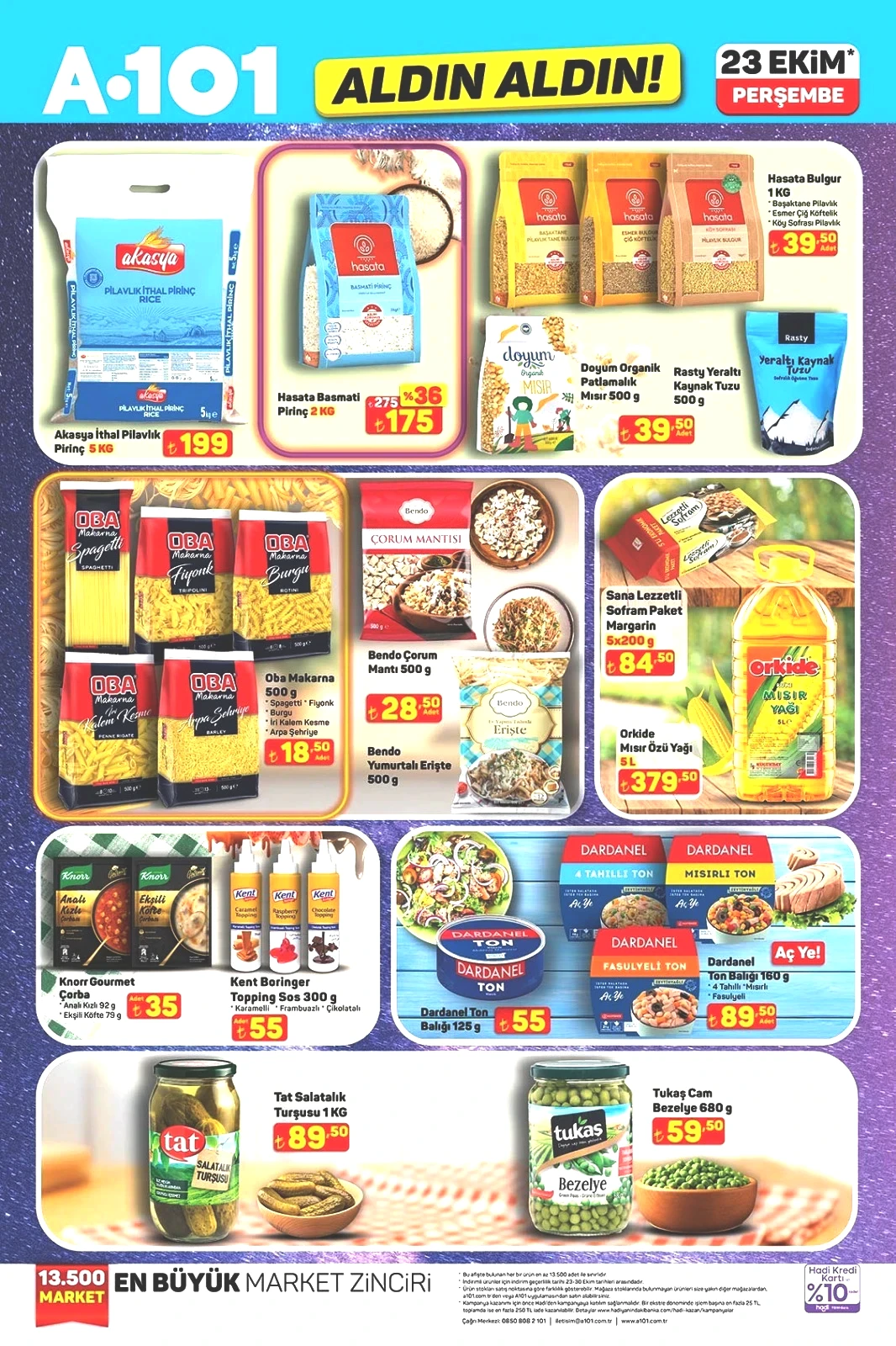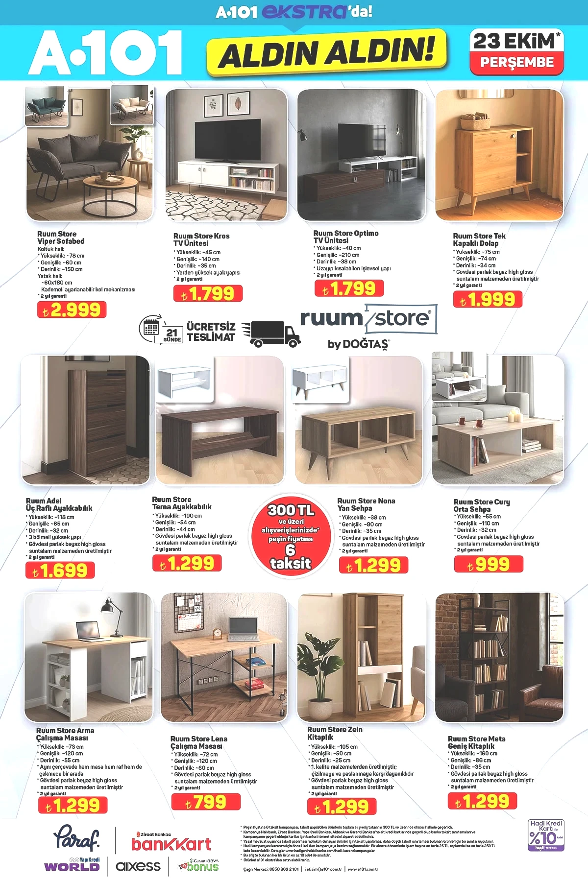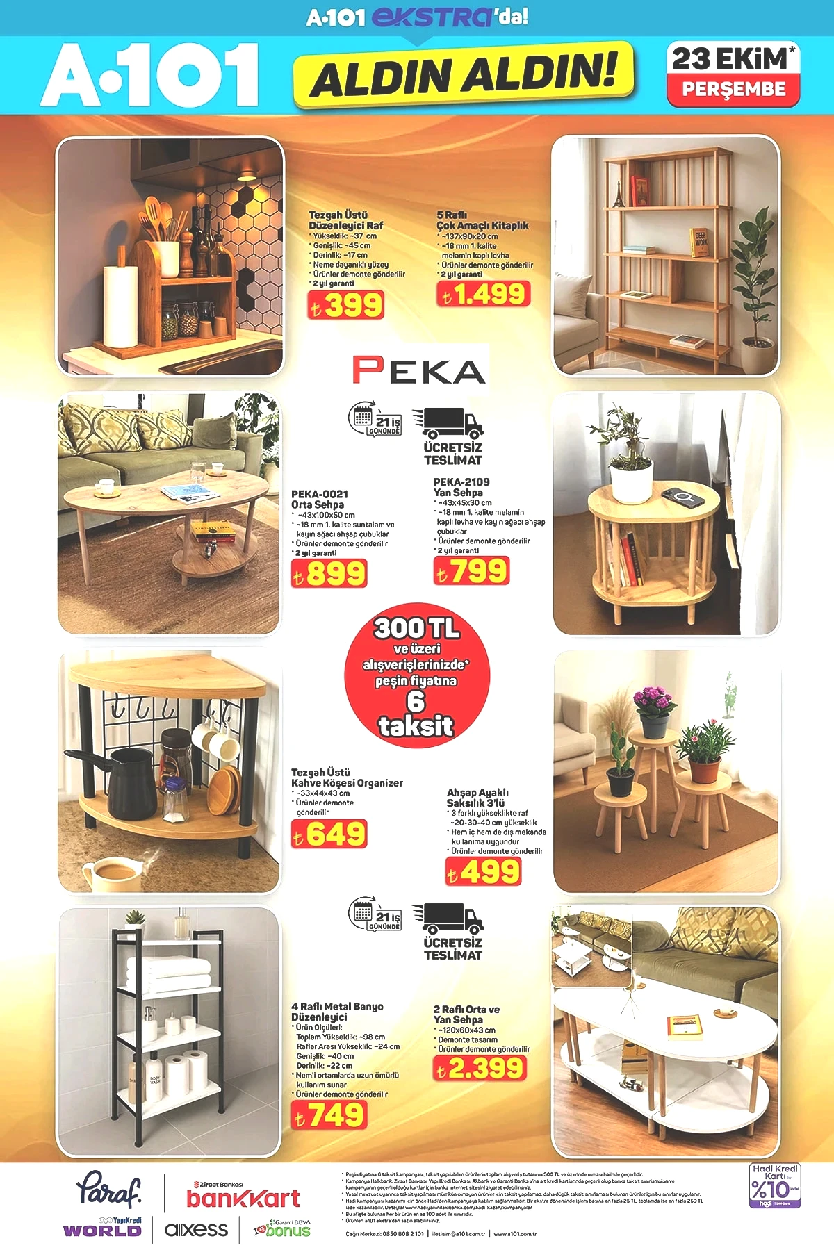 A101, 23 Ekim Perşembe itibarıyla geçerli olan yeni Aldın Aldın kataloğunu müşterileriyle buluşturdu. Bu haftaki kampanyada ev elektroniğinden beyaz eşyalara, mobilyadan kamp ürünlerine kadar pek çok kategoride indirimli ürünler raflarda yer aldı. Ayrıca, 300 TL ve üzeri alışverişlerde peşin fiyatına 6 taksit seçeneği de alıcıları bekliyor.