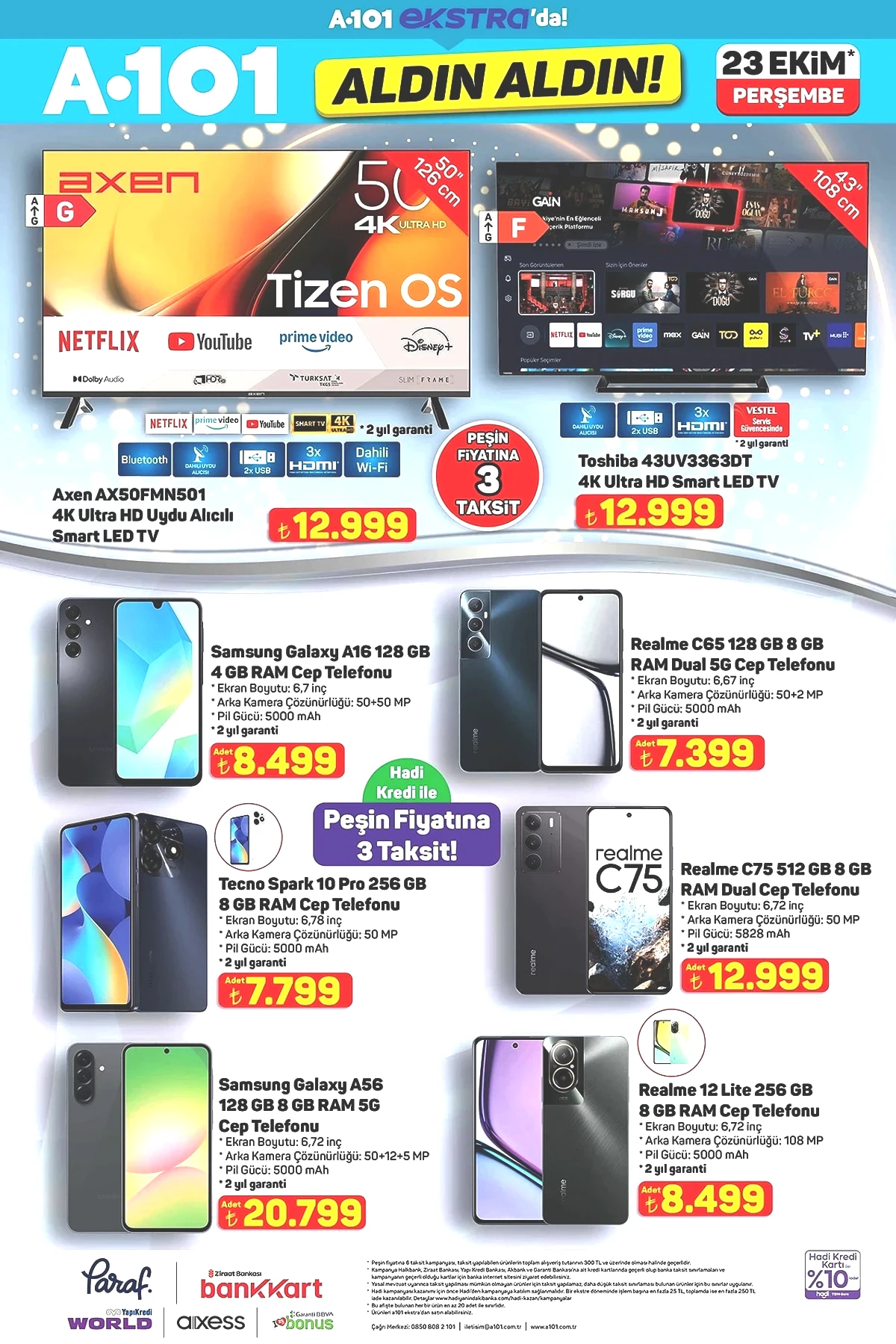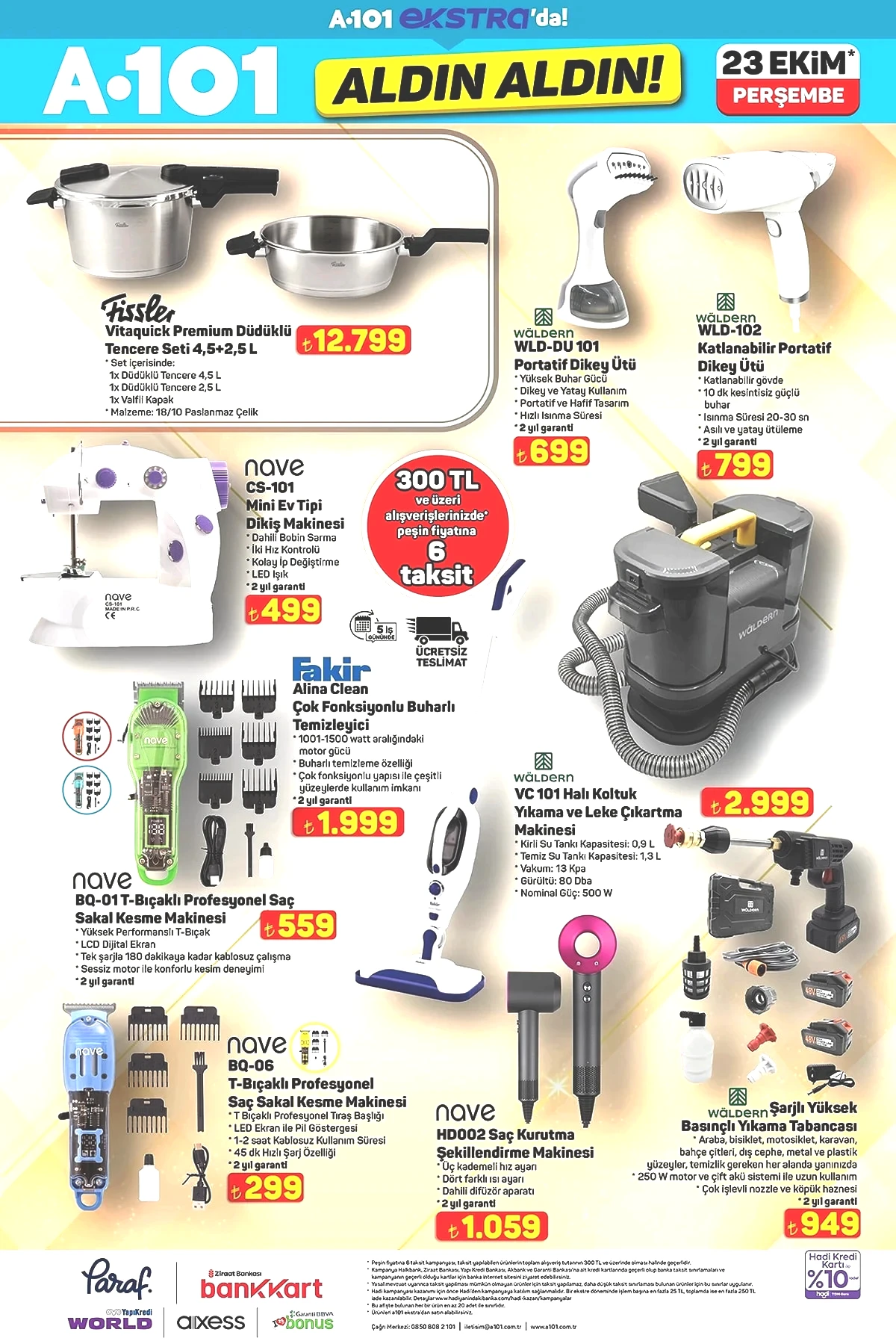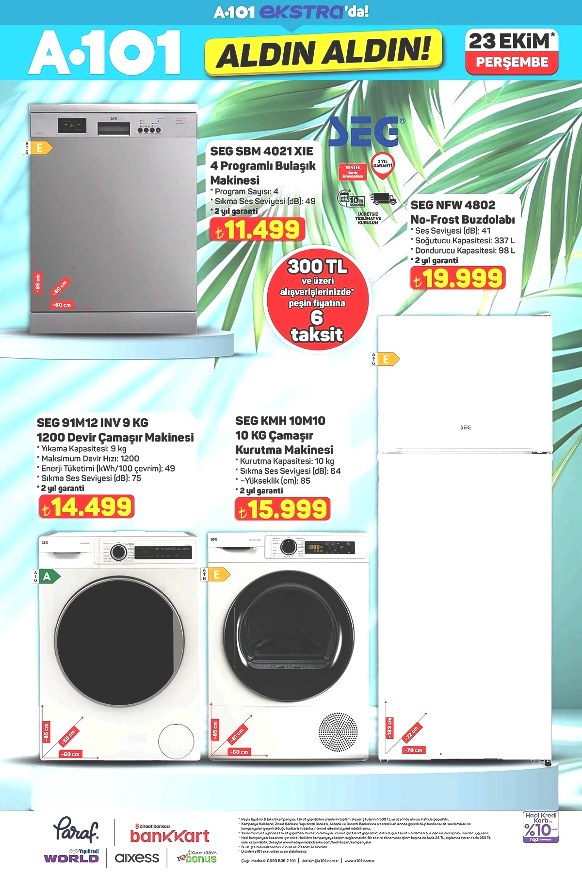A101, 23 Ekim 2025 tarihli Aldın Aldın kataloğunda ev elektroniği, beyaz eşyalar, gıda, evcil hayvan ürünleri, kamp ekipmanları ve giyim alanında büyük fırsatlar sunuyor. SEG, Altus, UGG, Ruum Store, Purina, Friskies ve WALKIE markalarının ürünleri stoklarla sınırlı olarak satışta. Ayrıca 300 TL ve üzeri alışverişlerde peşin fiyatına 6 taksit imkanı mevcut.